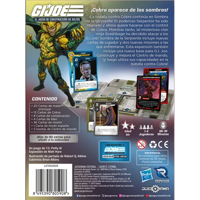 G.I. Joe: Sombra de la Serpiente es una expansión para G.I. Joe: El juego de construcción de mazos que introduce nuevos personajes, enemigos y misiones centradas en la amenaza de Cobra. Este contenido amplía la experiencia cooperativa del juego base incorporando nuevas cartas, líderes enemigos y escenarios adicionales, aumentando la variedad estratégica y la dificultad de las partidas. Es una expansión ideal para quienes desean profundizar en el sistema del juego y enfrentarse a desafíos más exigentes dentro del universo G.I. Joe.